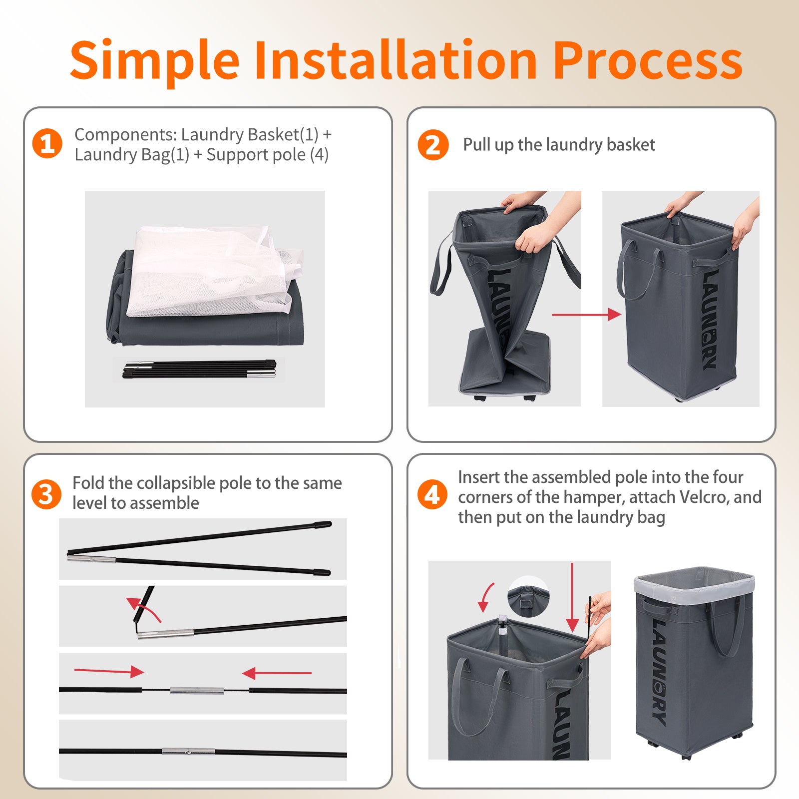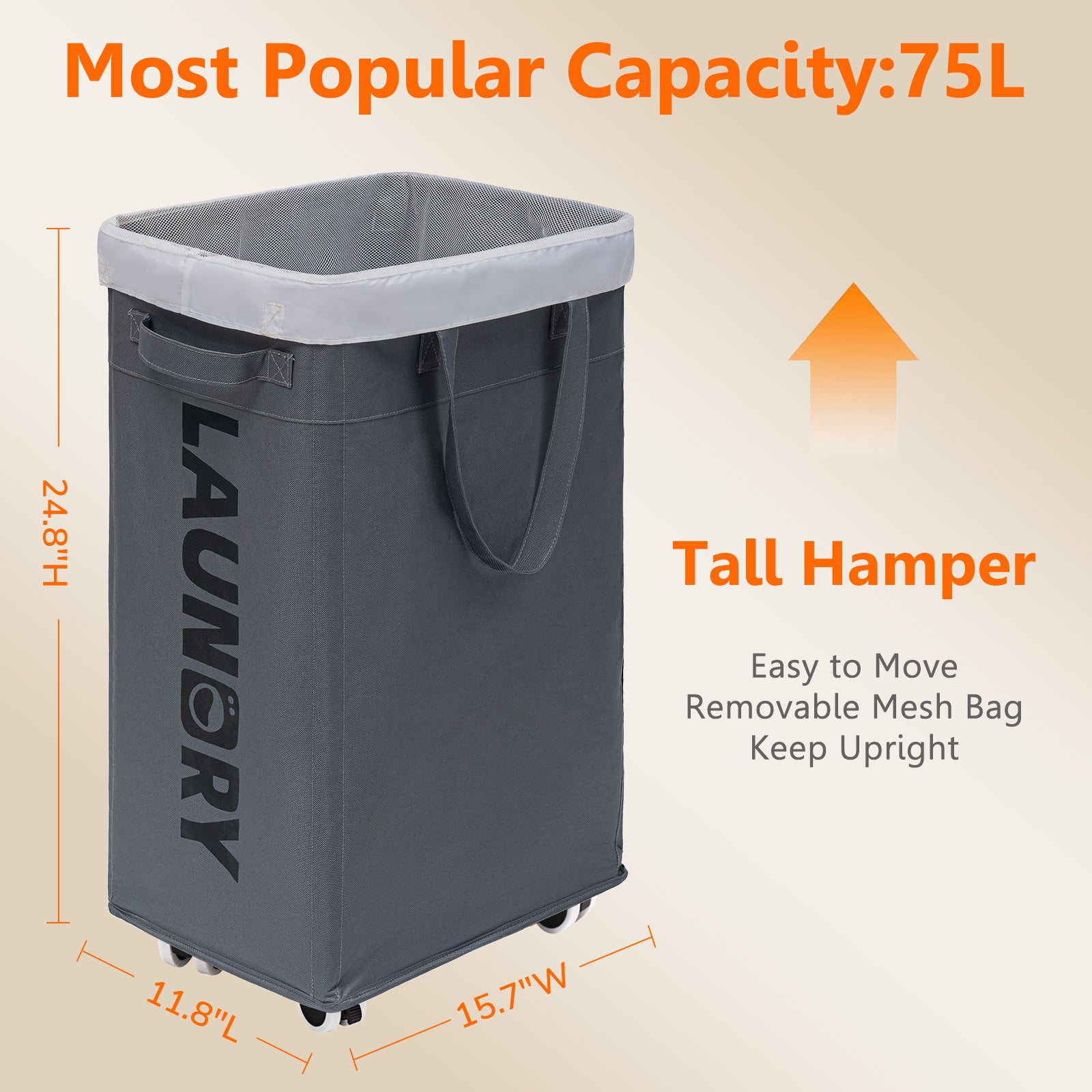 【Large Capacity & Space Saving】This wheeled laundry basket with dimensions of 15.7 x 11.8 x 24.8 inches and 75L capacity. Large Laundry Hamper to organize your home or dorm, hold many clothing while taking up little floor space 【Roller Design & Removable Mesh Bag】This laundry hamper is equipped with 4 smooth rolling wheels, 2 of which have brakes for easy movement and locking. The mesh bag is easy to pull out and carry, you can take out all your clothe and simply lift out the mesh bag, carry it to the washing machine. The handle is designed at a convenient height, saving you from bending over during movement 【Lightweight & Robust Build】 Our laundry basket is crafted from premium Oxford fabric with an internal PE coating, offering both moisture resistance and lightweight convenience. The sturdy metal frame ensures the basket stays upright, keeping your space tidy and stylish. When not in use, this laundry basket can be quickly and easily folded into a compact form, perfect for storage in a drawer, closet, or under a bed 【Versatile Storage & Handle Design】Tall storage basket can be used as a dirty clothes hamper, but also can be used to store toys, clothes, blankets, yoga mat, and other sundries.Perfect for any space—bedroom, bathroom, laundry room, or even camping and RV trips. The multiple handles are designed for versatile carrying options to suit your needs 【Care Instructions】To keep the laundry bin in top condition, avoid using a washer or dryer to clean it. Instead, simply wipe it down with a damp cloth. This simple action will help preserve the coating and wheels for long-lasting use |
